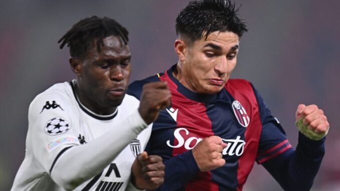 Wilfried Singo of AS Monaco competes for the ball with Santiago Castro of Bologna during the UEFA Champions League 2024/25 League Phase MD4 match between Bologna FC 1909 and AS Monaco at Stadio Renato Dall’Ara on November 05, 2024 in Bologna, Italy.